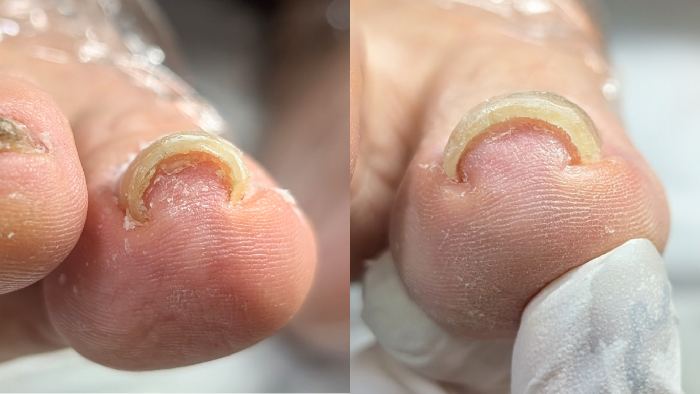 爪周りのカチカチの角質や爪の上の角質を放置していると、癒着した角質により巻き爪が助長されてしまいます。